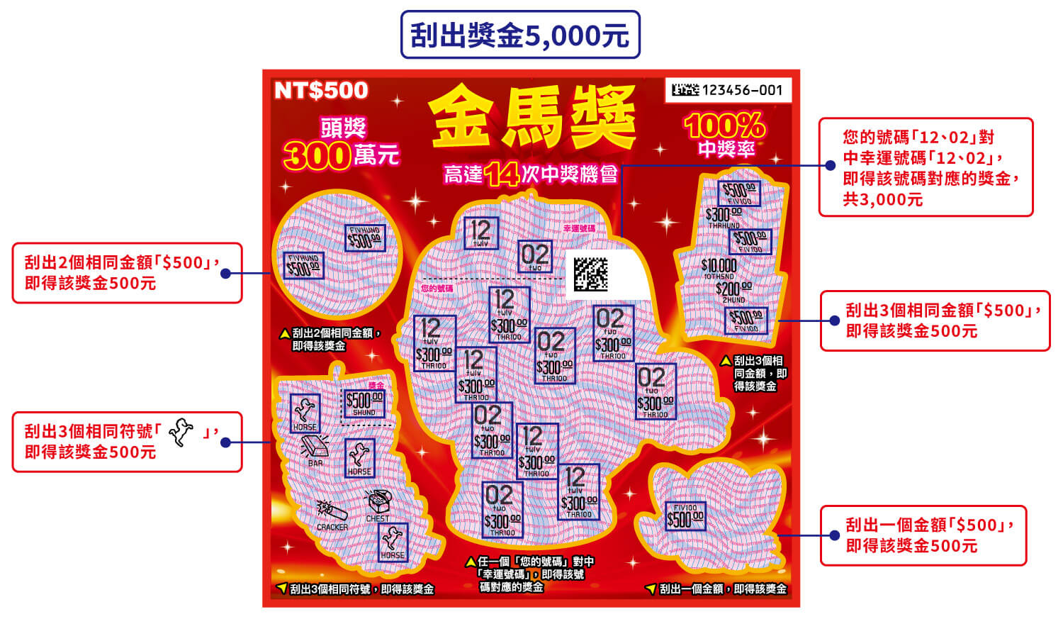 2. 刮出3個相同金額,即得該獎金