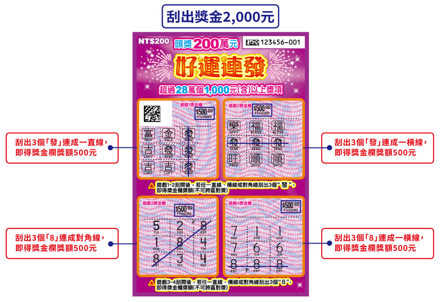 遊戲1~2:刮開後,若任一直線、橫線或對角線刮出3個"發",即得獎金欄獎額(不可跨區對獎)