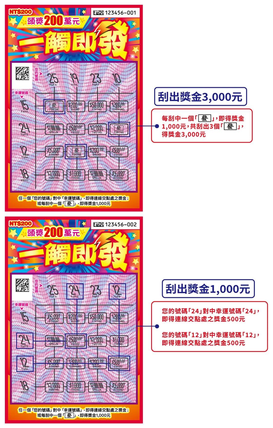任一個「您的號碼」對中「幸運號碼」,即得連線交點處之獎金;或每刮中一個「發字」,即得獎金1,000元