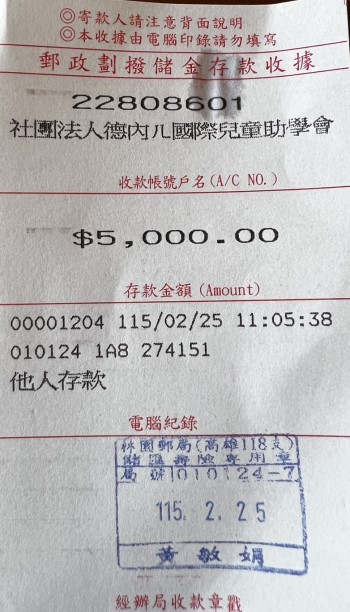 4.每次滿額捐款後,會將劃撥單據刊登本頁下方保存供瀏覽檢視,愛心捐款箱金額會再度歸零,並持續為幫助下一個社會弱勢團體努力累積金額.